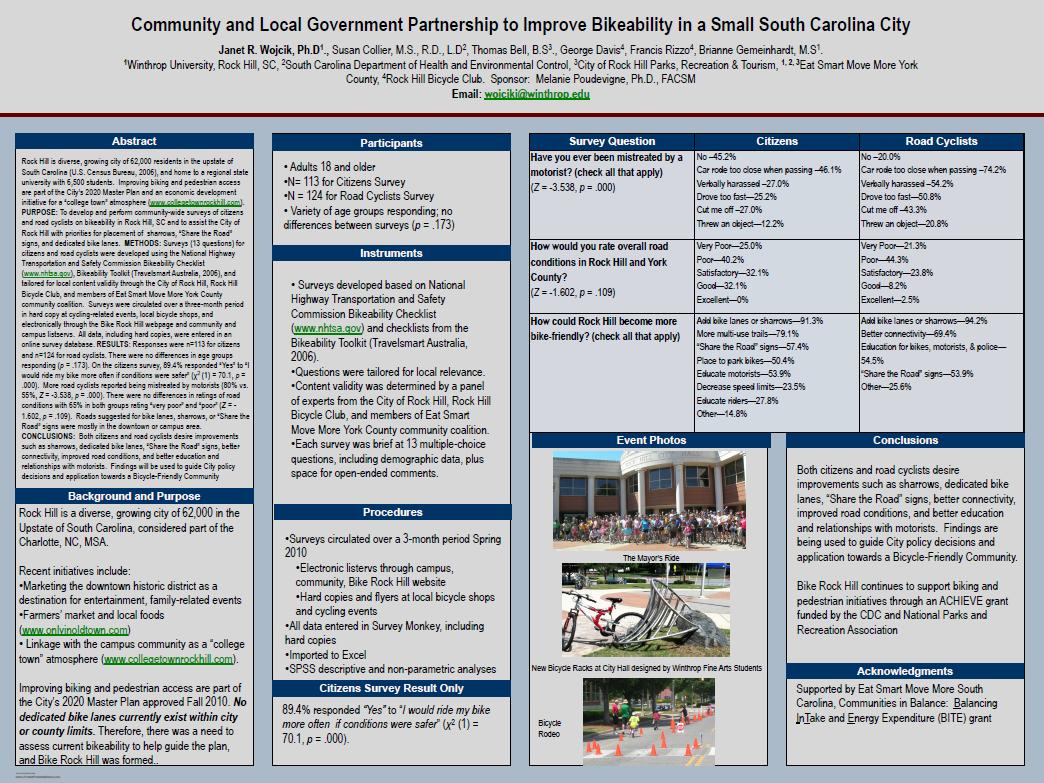 Recently, several members of Bike Rock Hill, a city-led organization working to make Rock Hill more bicycle friendly, presented their progress at the American College of Sports Medicine Annual Meeting earlier this month. These individuals, several of whom include Winthrop University faculty members, evaluated data from their bikeability survey and compiled the information in the following presentation (which can be viewed as a pdf here).