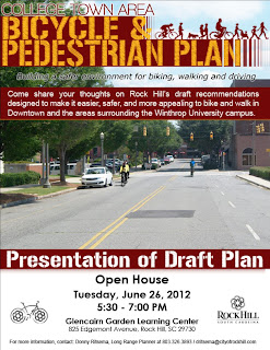 Just a few weeks ago, we worked with the City and the League of American Bicyclists to facilitate a bicycle friendly community workshop in Rock Hill. At this workshop, the City’s Director of Planning, Bill Meyer, announced that the City had invested in a bicycle and pedestrian master plan. Bill shared very preliminary information from this plan. And on June 26, the community at large can find out more about the master plan in a public input session.